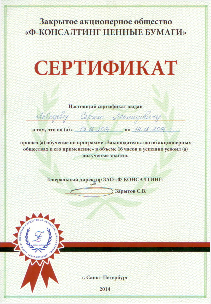СЕРТИФИКАТ обучения по программе "Законодательство об акционерных обществах и его применение"