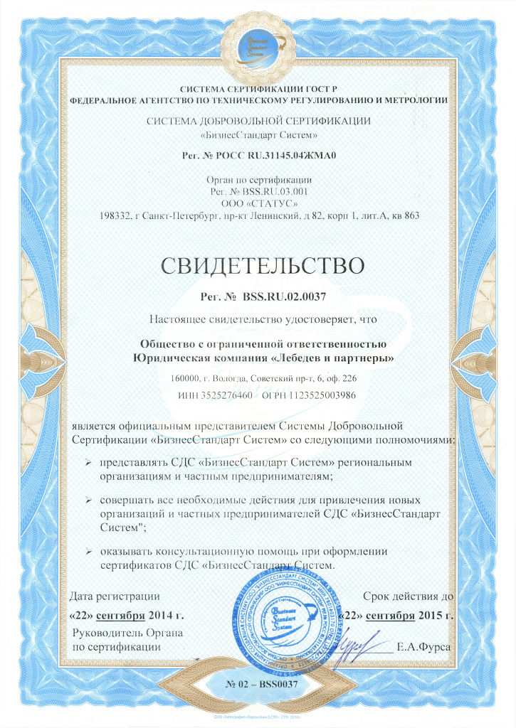 СВИДЕТЕЛЬСТВО СДС "БизнесСтандартСистем"
