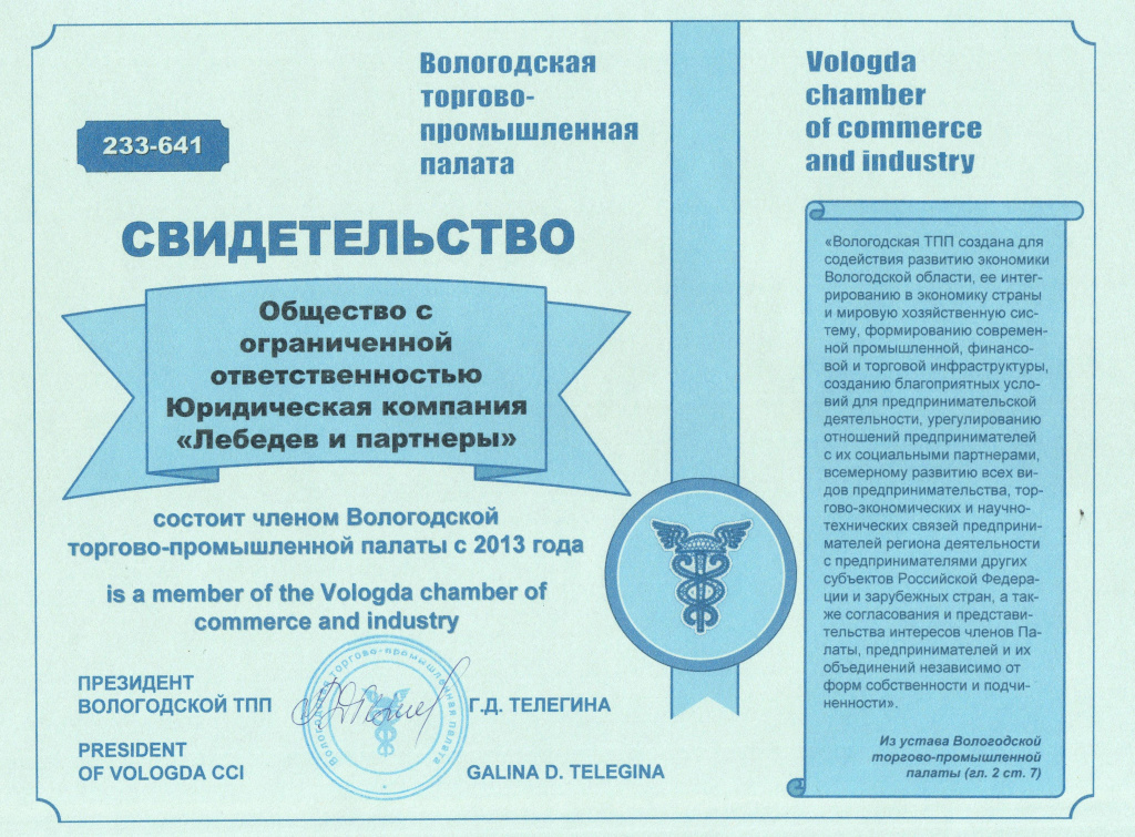 СВИДЕТЕЛЬСТВО Вологодской торгово-промышленной палаты
