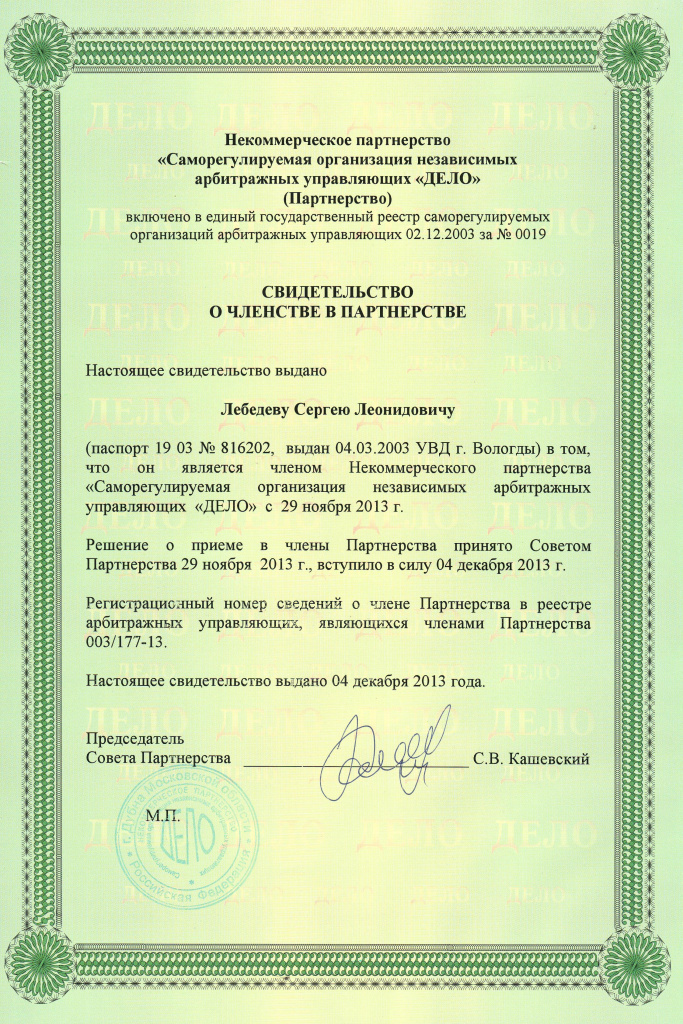 СВИДЕТЕЛЬСТВО "Саморегулируемая организация независимых арбитражных управляющих"